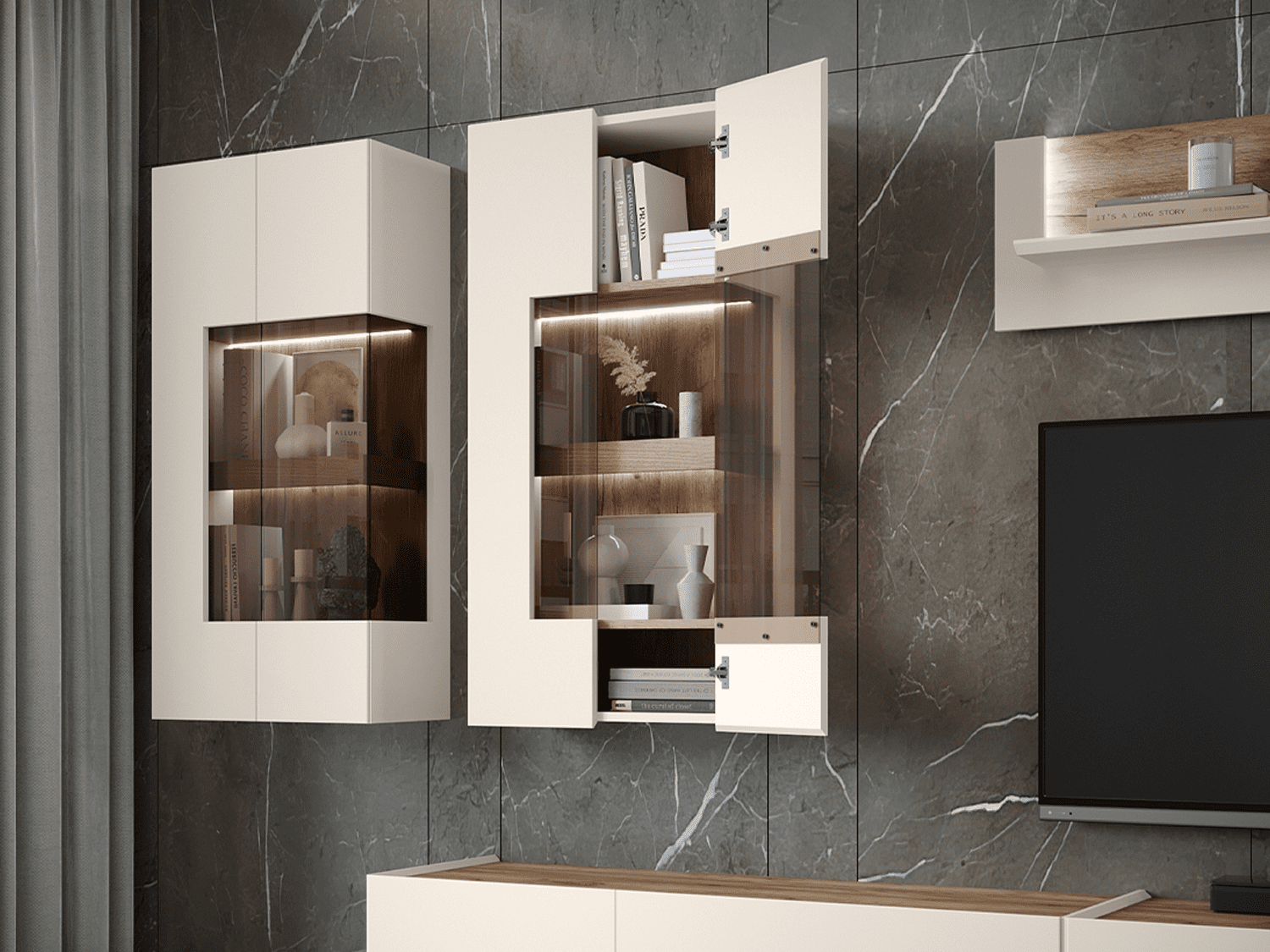 – Poseduje soft-close šarke ,soft-close klizače, push-to-open mehanizme, dekorativne metalne nožice i led rasvetu