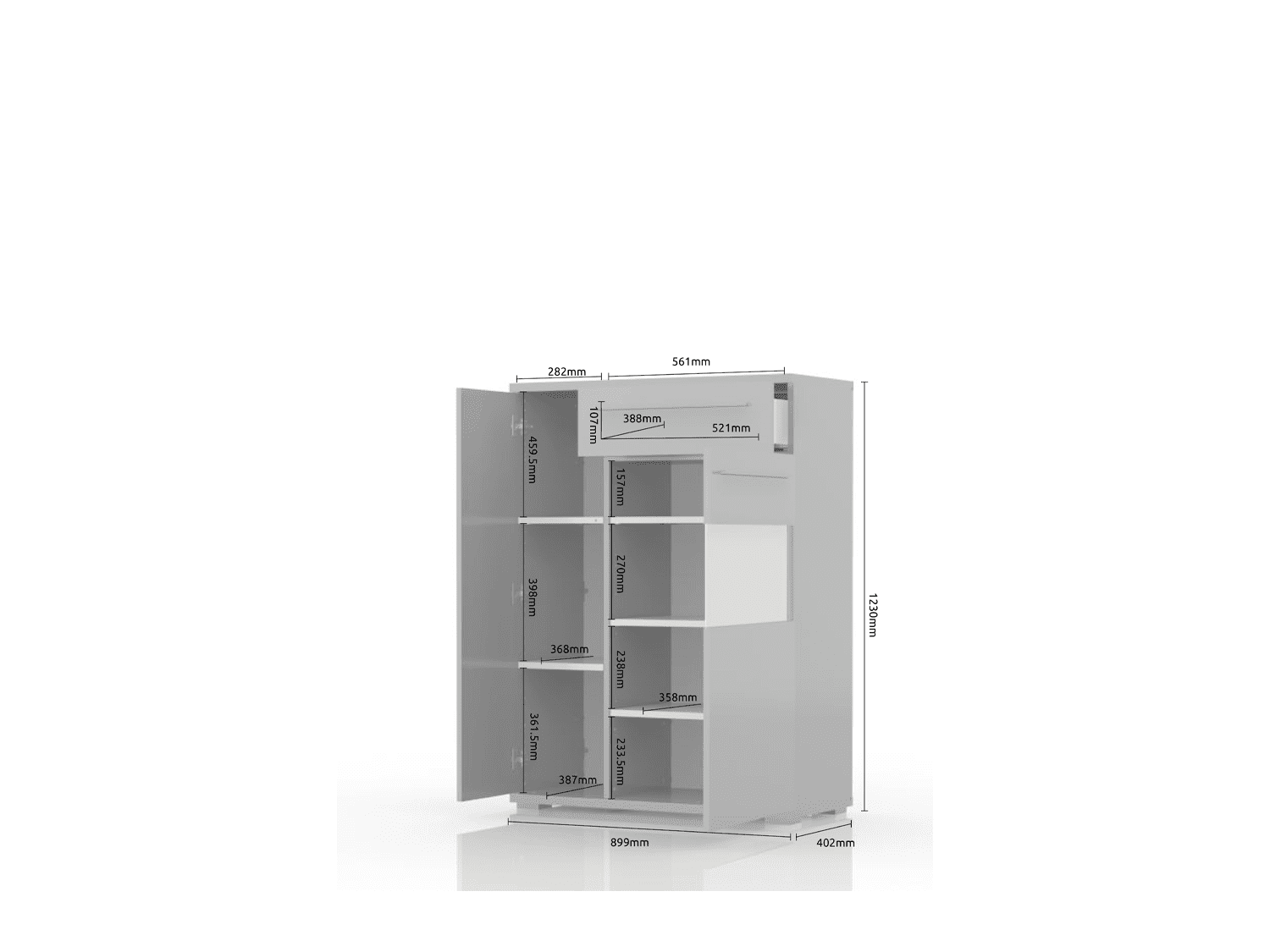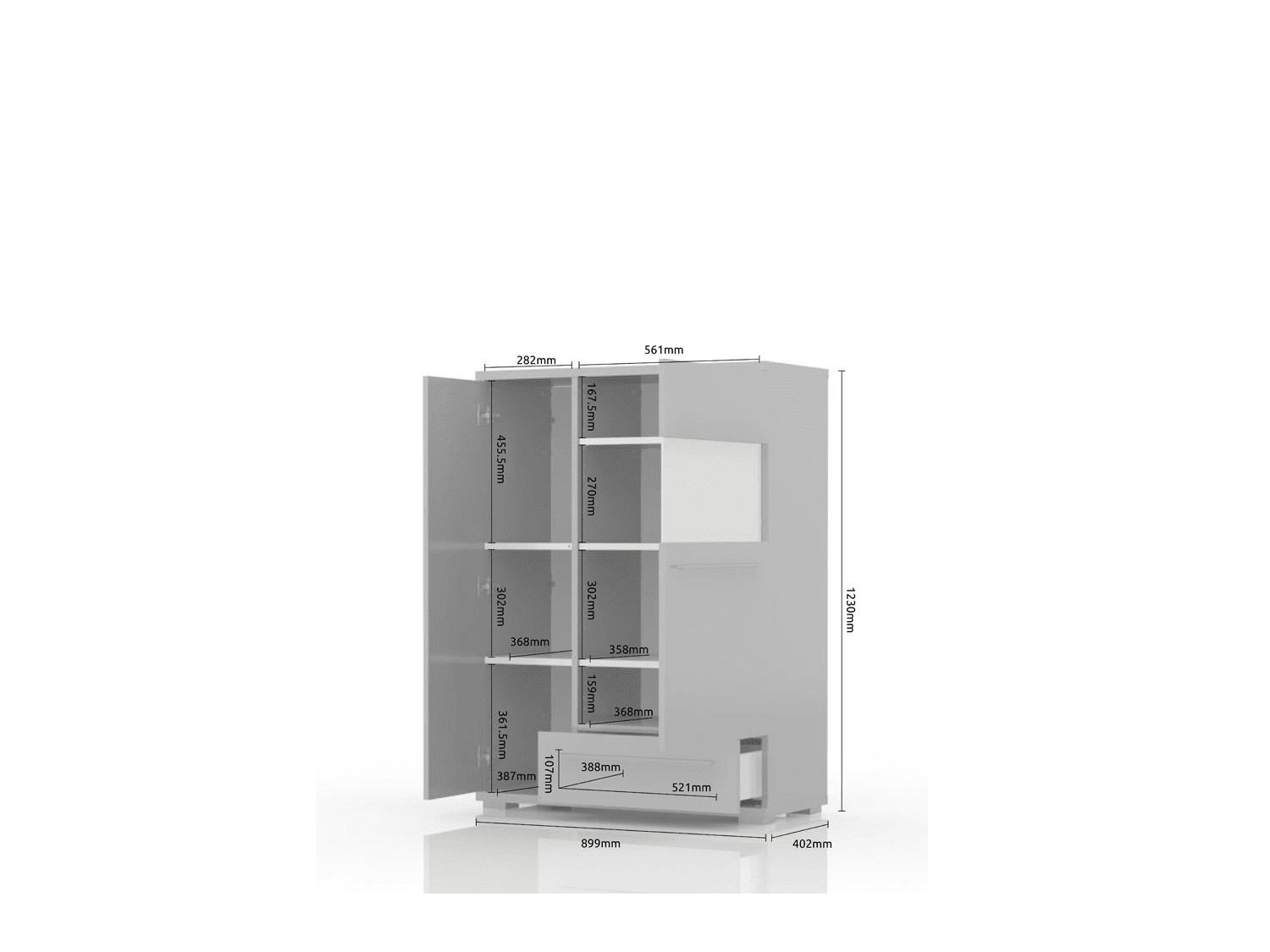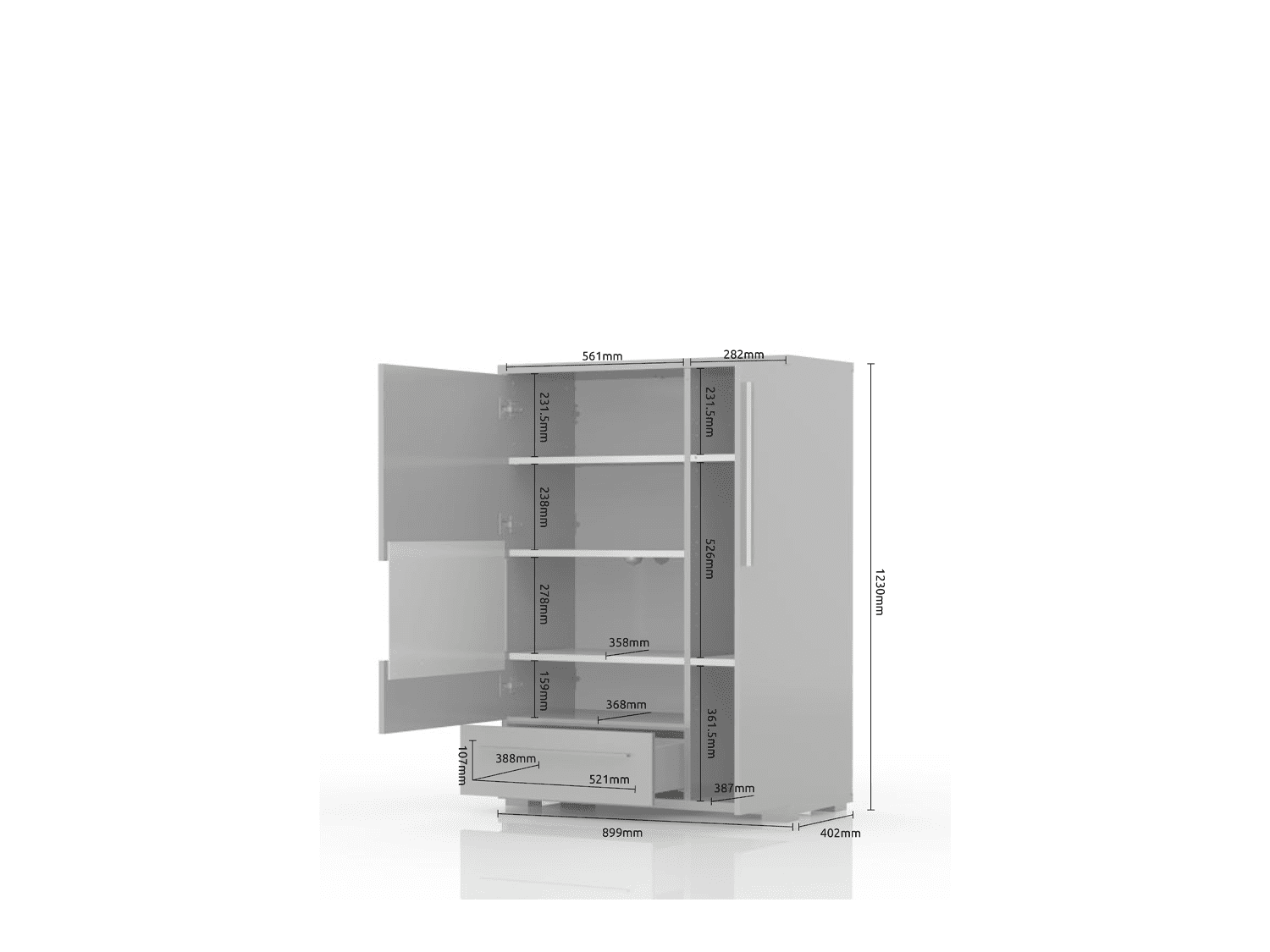 – Poseduje fioku, pet polica, soft-close šarke, soft-close klizače i hromirane ručice