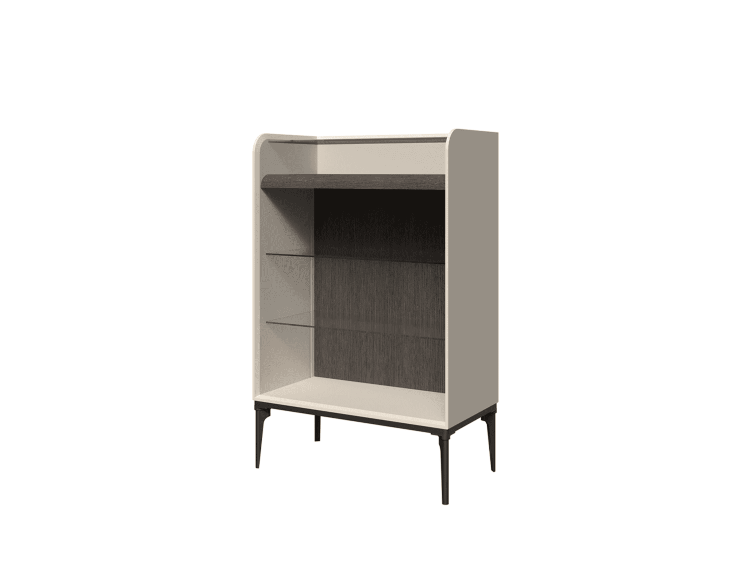 – Poseduje dve staklene police od parsol grey stakla debljine 6mm, metalni ram, led rasvetu, metalne nožice, metalne ručice i soft close šarke