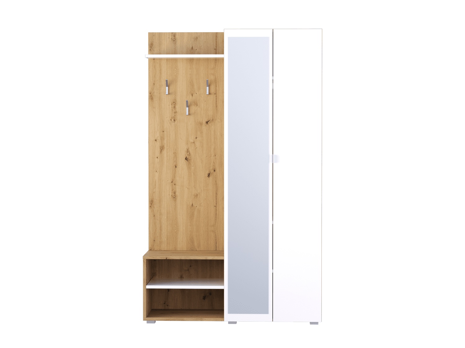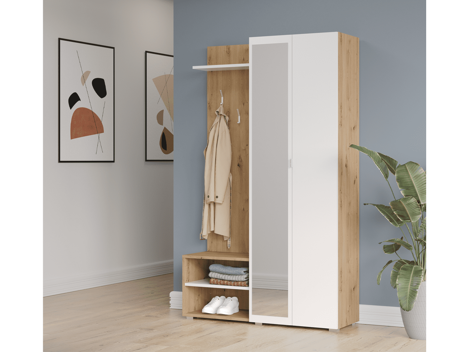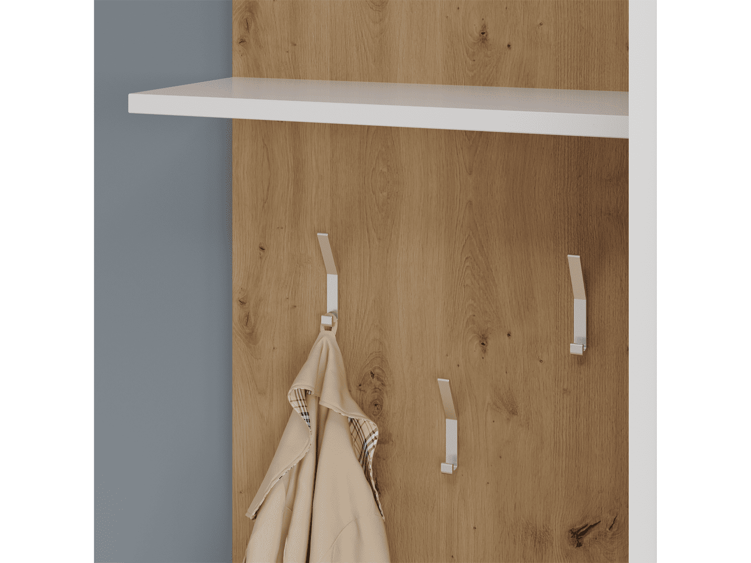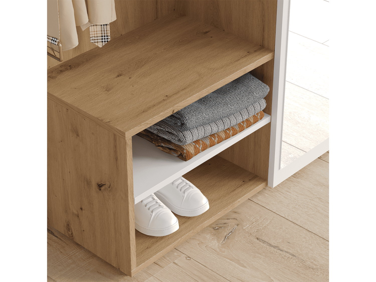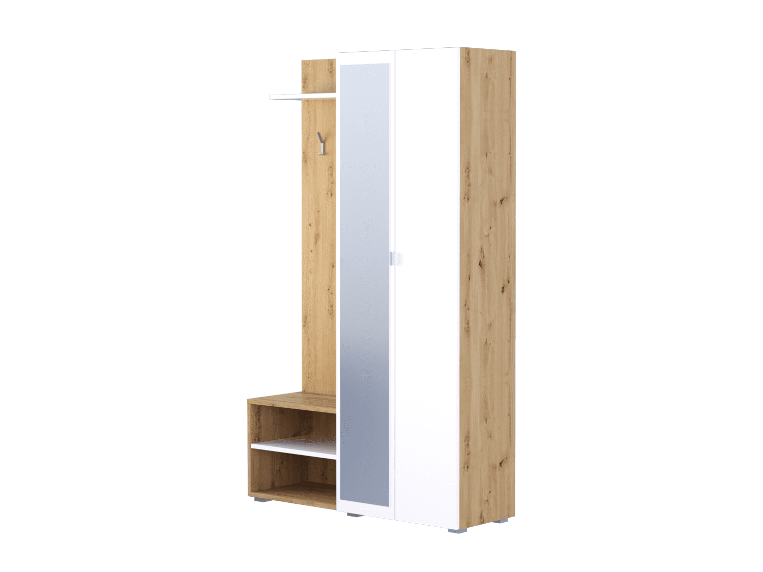 – Poseduje ogledalo, tri police i tri vešalice za odlaganje garderobe