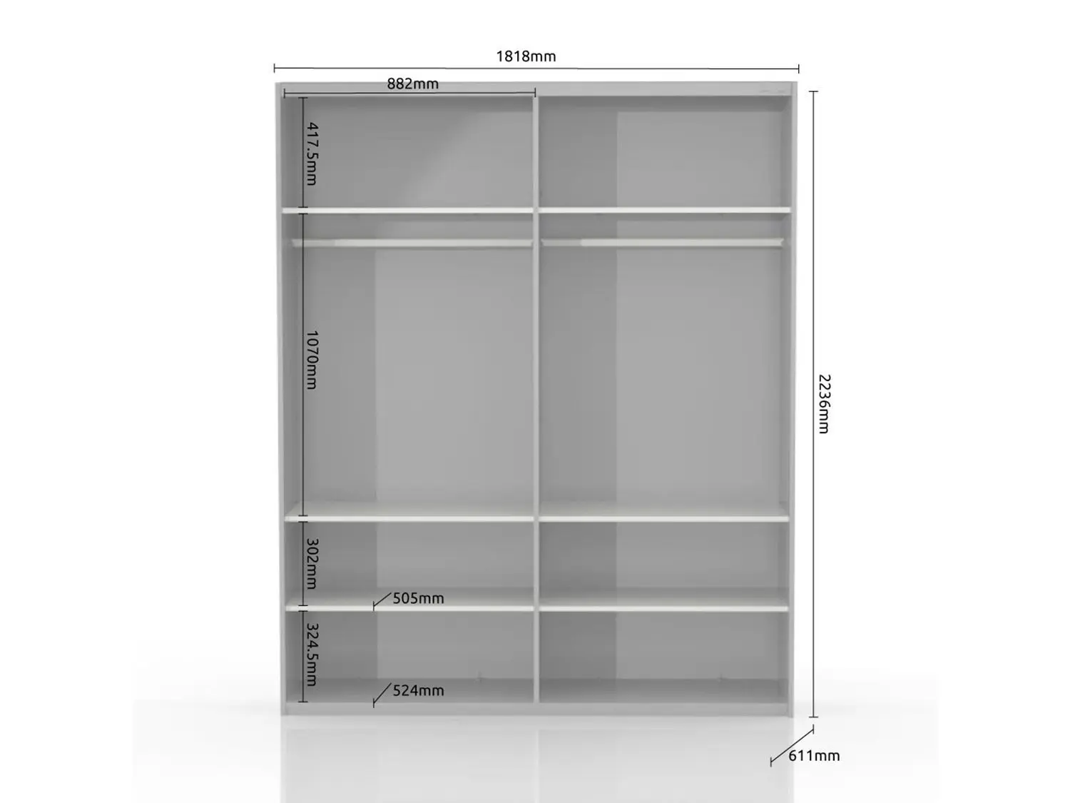 – Poseduje šest fahova,dve garderobne šipke,podesive nožice,soft-close mehanizam za zatvaranje krila