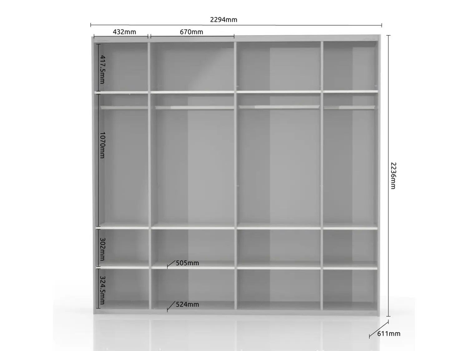 – Poseduje šest većih i šest manjih fahova,četiri garderobne šipke,podesive nožice,hromirane integrisane ručice,soft-close mehanizam za zatvaranje krila
