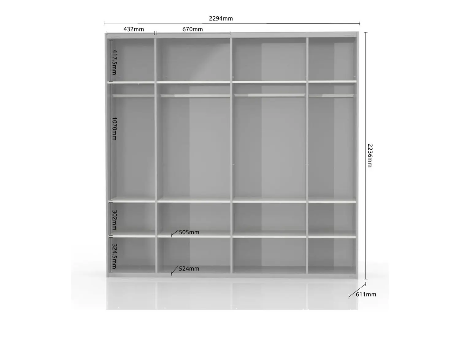 – Poseduje šest većih i šest manjih fahova,četri garderoberne šipke,hromirane integrisane ručice,soft-close mehanizam za zatvaranje krila