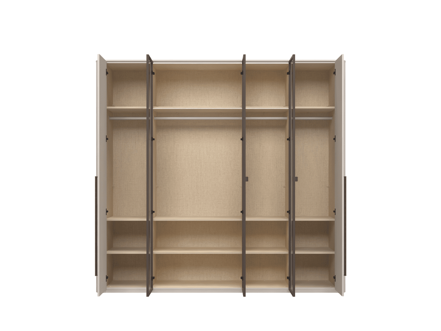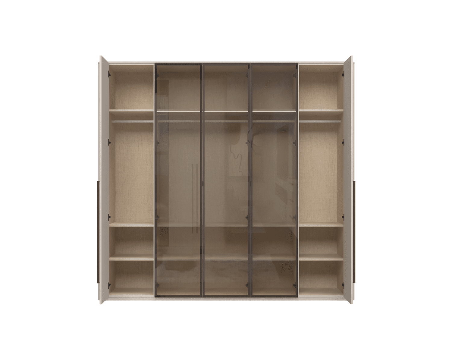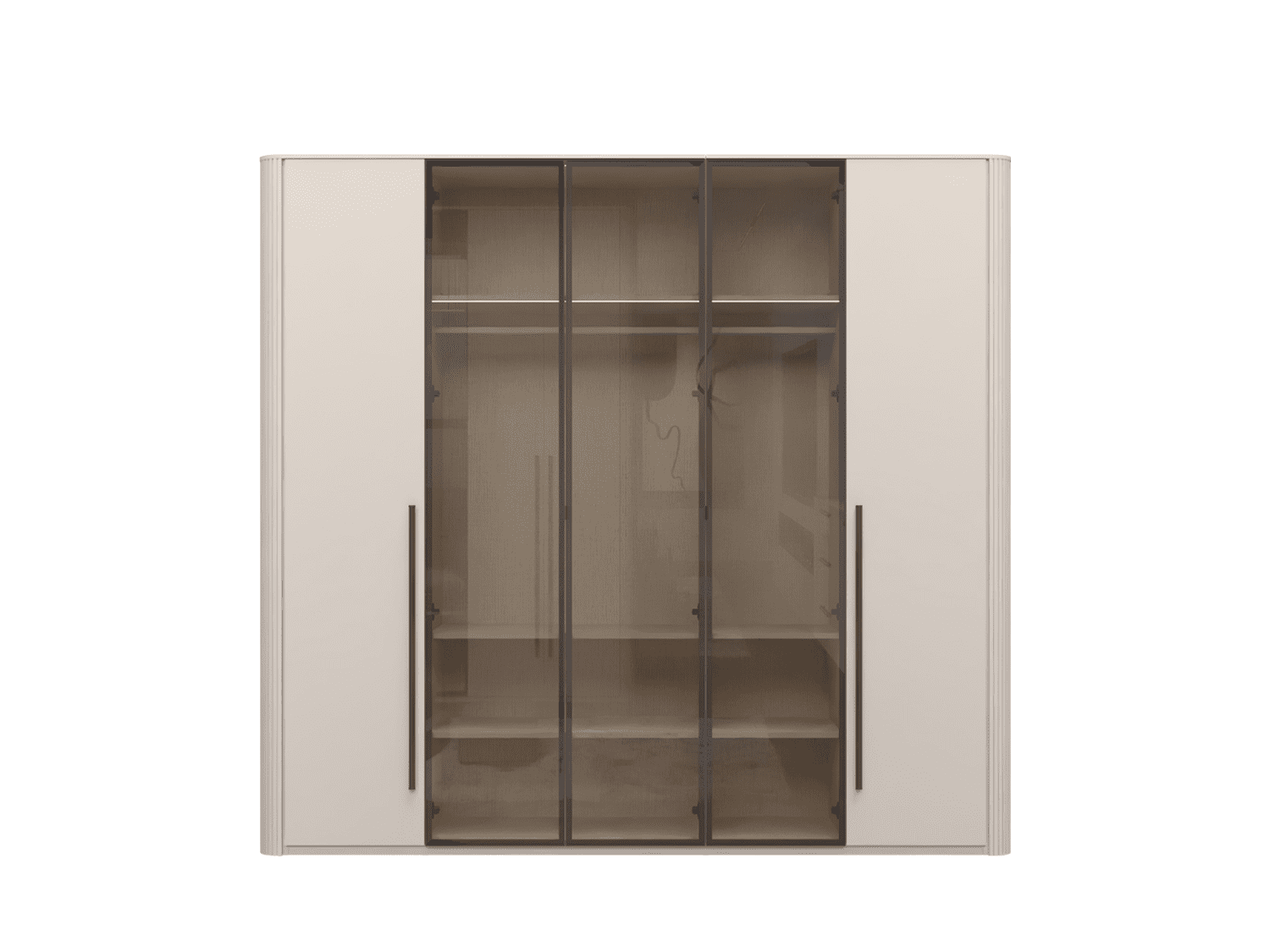 – Plakar sa 3 krila u UV soft mat laku, dekor Kašmir, uz 2 staklena fronta sa aluminijumskim ramom u dekoru Midnight Copper (parsol brown staklo 4 mm).