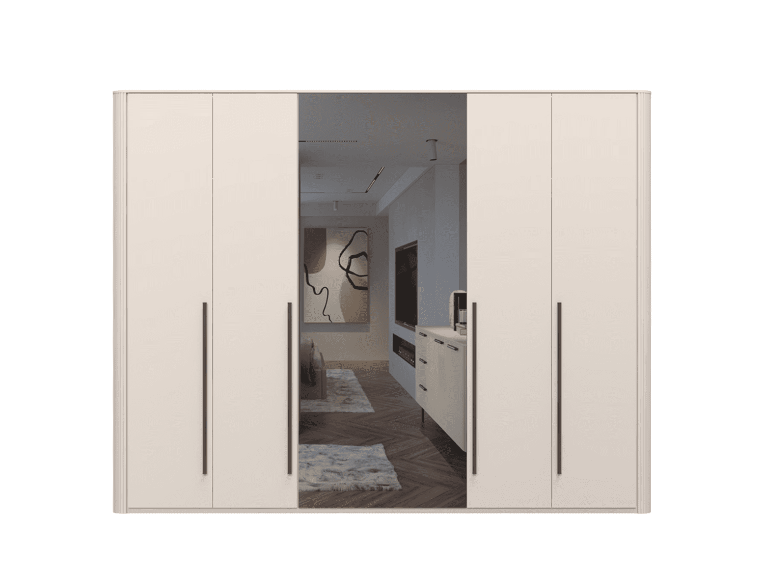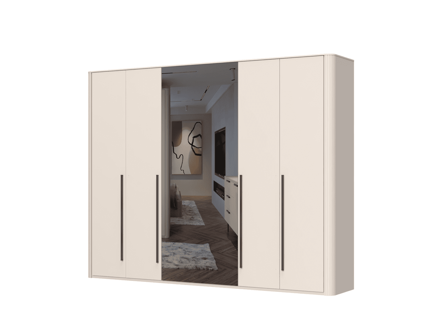 – Kombinacija lakiranih frontova i ogledala za vizuelno proširenje prostora