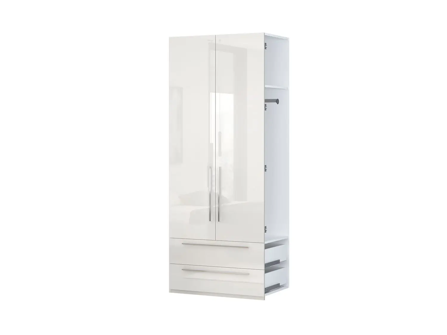 – Poseduje soft-close šarke i klizače,podesive nožice,tri faha,garderobernu šipku
