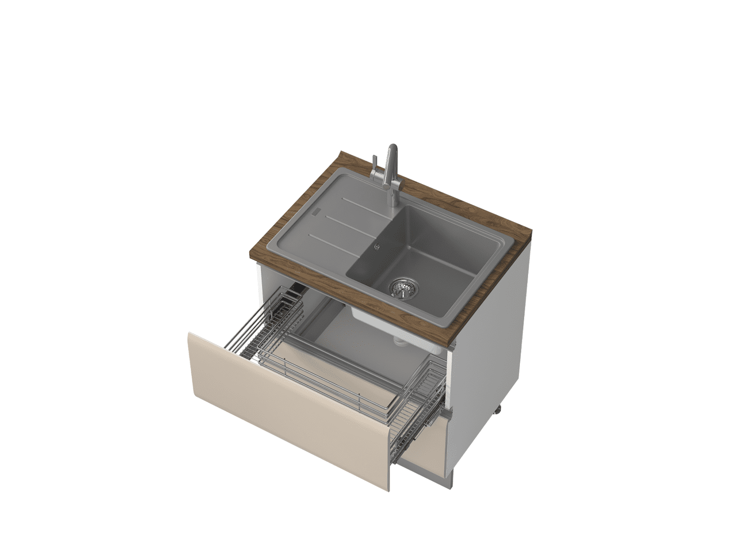 – Jedna fioka sadrži hromiranu žičanu korpu čiji je oblik prilagođen sifonu sudopere, a druga je metal-box fioka nosivosti do 30 kg