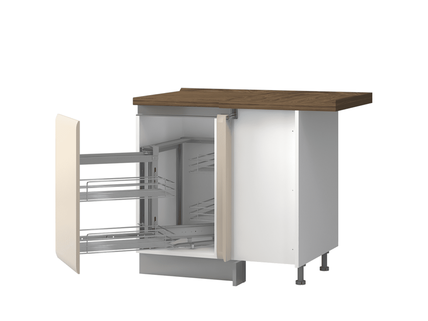 – Poseduje mehanizam sa četiri hromirane žičane korpe, soft-close šarke i podesive nožice